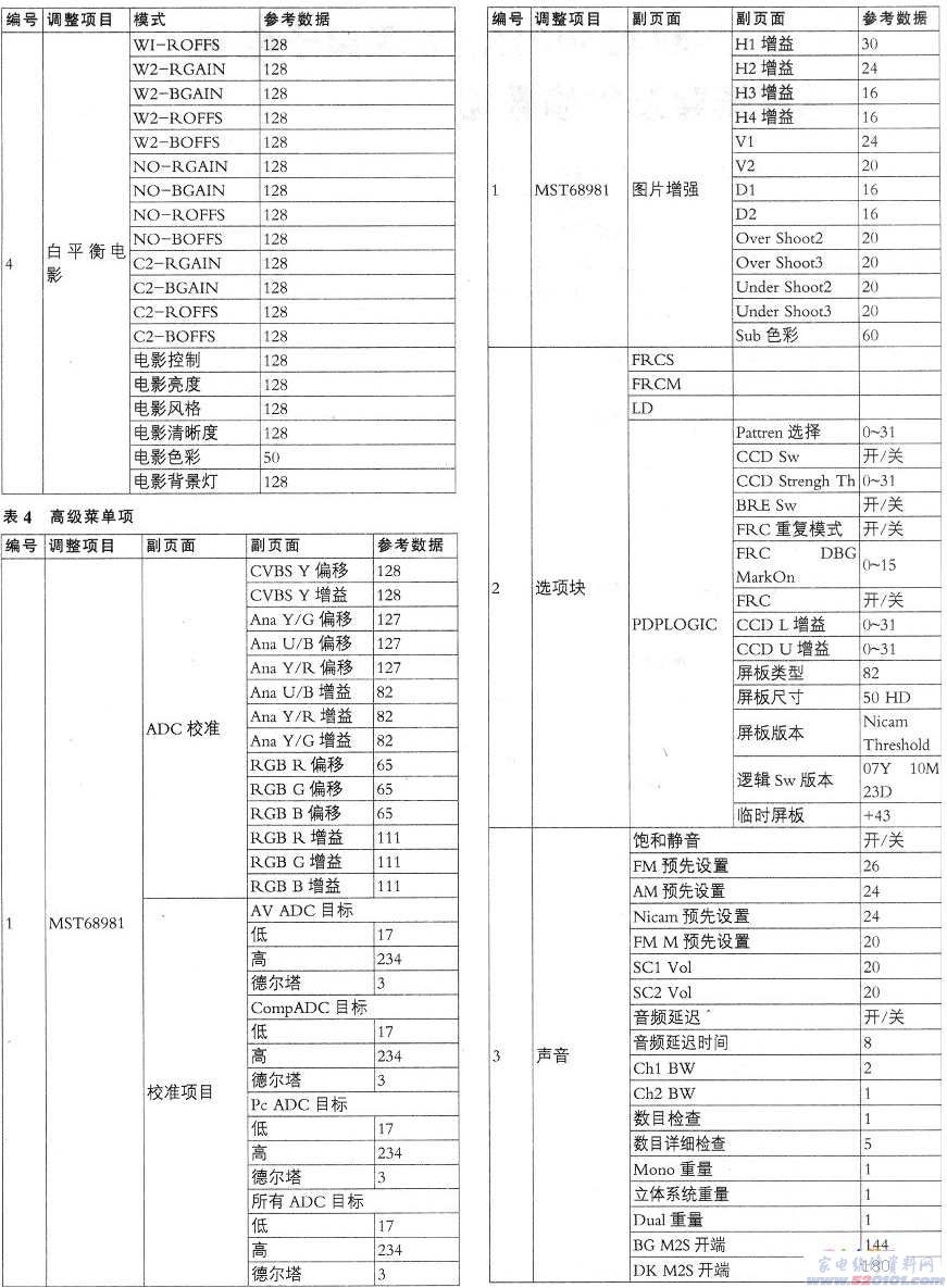 调节方法及数据: 按遥控器上下及左右方向键选择调整项目及维修数据调整,“菜单”键将修改内容存入EEPROM,并返回上一级模式。
