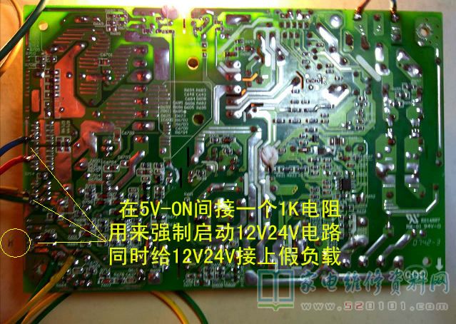3.给5V输出挂上假负载,接上220V供电,初试该电源板5V状态。假负载灯泡点亮。测假负载