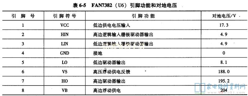 FAN7382 (U6)是一款高边和低边栅极驱动单片集成电路,能够驱动工作电压达到+600V的MOSFET或绝缘栅双极型晶体管(IGBT)。 FAN7382采用两种供电电压,其内部电路框图如图6-12所示;引脚功能和对地电压见表6-5。