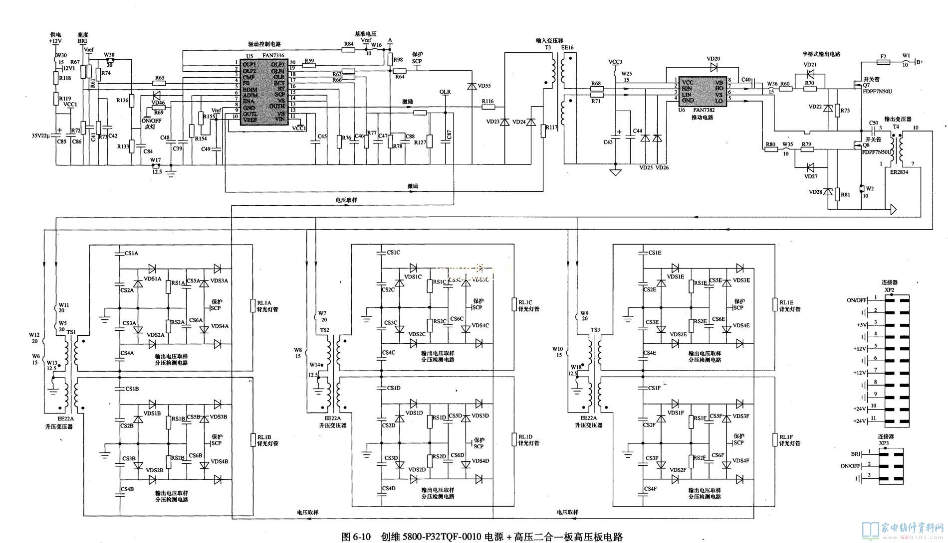 推动电路由输入变压器”、激励电路U6 (FAN7382)组成;升压电路由推挽输出升压电路MOs开关管Q7、Q8、输出变压器T4、升压变压器TS1~TS3组成。