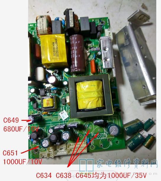 我们维修多台创维32L01HM等8M19机芯液晶电视,发现此类故障多集中在电源板上,而电源板上的问题又集中在滤波电容身上。上述故障1、2、3通常是C649和C651冒顶变值所致。上述故障4、5通常是C634、C638、C645冒顶变值所致。如果发现电源板上这些电容冒顶,换新后基本都可以手到病除。