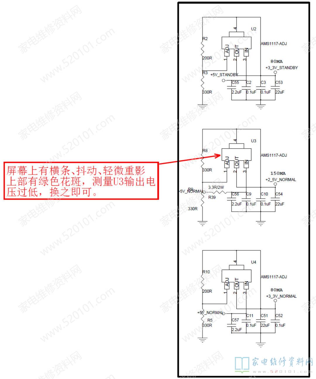 一台创维39E61HR液晶电视(8M50主板)出现图像抖动、图像重影灯故障,具体现象是屏幕上由横条、抖动、轻微重影上部有绿色花斑,测量U3输出电压过低,更换后故障修复。附:39E61HR 8M50主板原理图。 ...