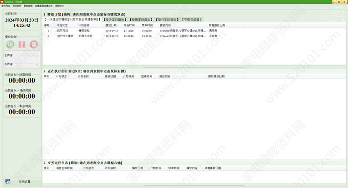 远方定时播放音乐软件是一款绿色免安装的软件,适用于学校、部队、公司、工厂、公园、商场、酒店等场所音乐的自动播放,可用于作息时间的自动控制播放音乐。
