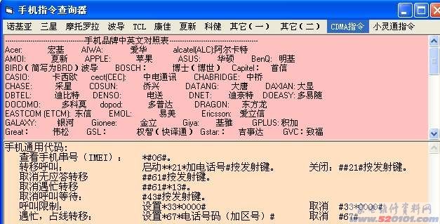 这个软件可以查询时下流行各种品牌手机指令(测试指令-解锁指令),其中还包括许多小灵通的指令收录。