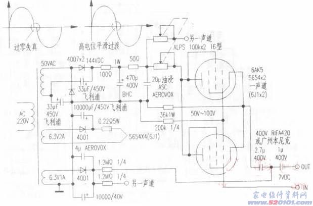 用100Ω和50Ω两只高品质电阻和第一级整流滤波连续组成三级线性化无相移滤波。两只电阻和“BHC”、“AEROVOX”组成的滤波通道,使B+电源对音频信号的干扰最小和对音色的美化作用加强,再用ALPS16型电位器作线性分压和声道隔离。实践验证:当B+为40VDC时,音色圆润;B+为100VDC左右时,更加通透和有力度。ALPS有40~20VDC之间的调整范围。