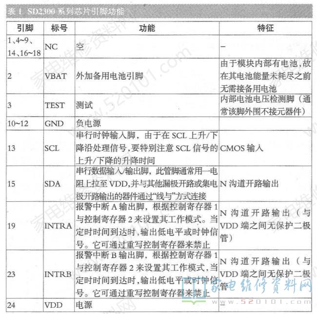 SD2300系列芯片是一款内置晶振、支持串行接口的高精度实时时钟芯片,其引脚功能见表1。该系列芯片在25±1°C条件下可保证时钟精度为±5ppm (ppm 表示百万分之一),即年误差小于2.5分钟;该芯片内置时钟精度调整功能,可以在很宽的范围内校正时钟的频率偏差,能以最小分辨率3.052ppm来进行校正,通过与温度传感器的结合可以设定适应温度变化的调整值,实现在竞温度范围内高精度的计时功能;内置串行NVSRAM(非易失性存储),擦写次数可达100亿次;内置一次性电池,在外部掉电情况下使用时间超过五年。