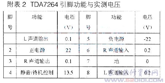 TDA7264是飞利浦公司推出的一款MULTIWATT8脚封装、BTL型输出的双声道音频功放。是专为Hi-Fi音乐设备、高质量电视机而设计,功放块输出级采用DMOs型场效应管与双极型晶体管混合搭配。使Ic具有电压供电范围宽(±10v~±25V或10V-50V)、输出功率大(在VS=±20V、THD=10%、RL=8Ω时,PO=2×25W)、噪音低、线性好、失真低,耐压高、音色优美且自身损耗低(典型值±20V供电情况下的静态电流仅20mA)等特点。除此以外,该块还具有开/关机静音(避免了开关机时扬声器发出的“噗”“噗’’声)、过热(140℃)保护、短路保护、待机控制(当④脚电压低于1.4V时.工作于待机模式,内部电路停止工作,以减小能耗)、静音控制(当④脚电压低于1.5V时,工作于静音模式,关断信号通道)、外围元件少等优点。是高级音响、车载音响、高音频质量电视机常用的音频放大IC。附图2是它存TcL王牌TcL-HiD432型背投彩电上的应用电路,附表2是它的引脚功能及在该彩电上的实测直流电压值。