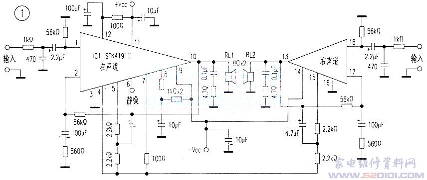电路如图1所示:左声道音频讯号从Ic1(STK4191Ⅱ)①脚输入,经放大后从⑩脚输出50W音频功率推动左声道(8Ω)喇叭RL1发声.右声道讯号从(18)脚输入,经放大后从(13)脚输出50w音频功率推动右声道喇叭RL2发音。