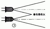 安装时调节发射部分三极管VT1的静态电流在30mA左右。接收部分只要安装无误,不需调试即可工作。发射部分可以安装在电视机内部,由机内12V电源供电。信号输入端接到音量电位器两端即可。对于伴音功放采用直流音量控制的电视机,可以在C1前面串联一个5.1kΩ的电阻后将输入端接到扬声器的两端。调节音量电位器,使其转发距离最远(3~4m)且不失真即可。两只红外线发射管(VD1。VD2)在安装时,要考虑其辐射区范围,由于红外发射管的辐射角一般在60°左右,所以安装时要使它们的辐射空间范围有一部分重叠,如图3所示。
