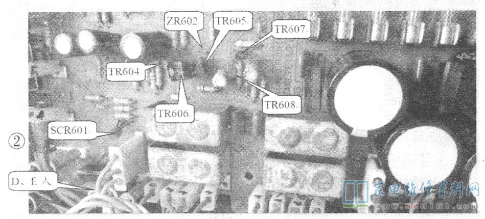 在功放电路正常时,功放后级功率输出端保护电路的D(左声道)、E(右声道)输入电压小于0.7V,此时可控硅SR601截止,三极管TR604集电极所接分压电阻R608、R609的中点电压为18.5V , TR604集电极电压为7.2V(主要是受ZD602稳压管控制),TR605、TR606导通两组的功放音频输出继电器RL01、RL02吸合,输出音频信号。当功放后级功率放大输出保护端D或E点的电压大于或等于0.7V时,可控硅SR601 导通,旁通了R609与TR604,则TR604集电极电压为0V,TR605基极电位为0V,TR605、TR606 均截止,RL01、RL02断开,无音频信号输出。