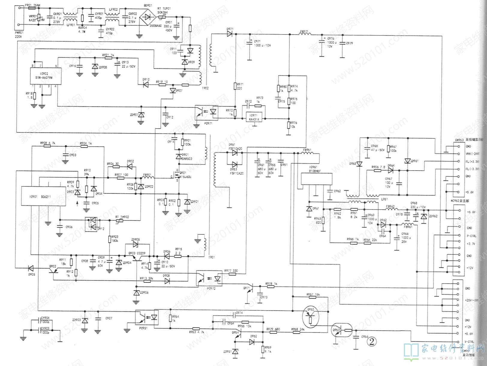 机器正常时检查电源板,在测量主板一侧的供电排线插座时,不经意碰了该线,机器马上就不正常了:此时电视机播放的彩色画面变为绿屏,且没有声音。看来问题在该插座,经检查插针、插座没有氧化现象,确定为线路板背面插座有几个焊盘引脚已脱焊。补焊后,机器恢复正常。附上该机的线路框图(如图1所示)及电源板实测电路(如图2所示),供维修时参考。