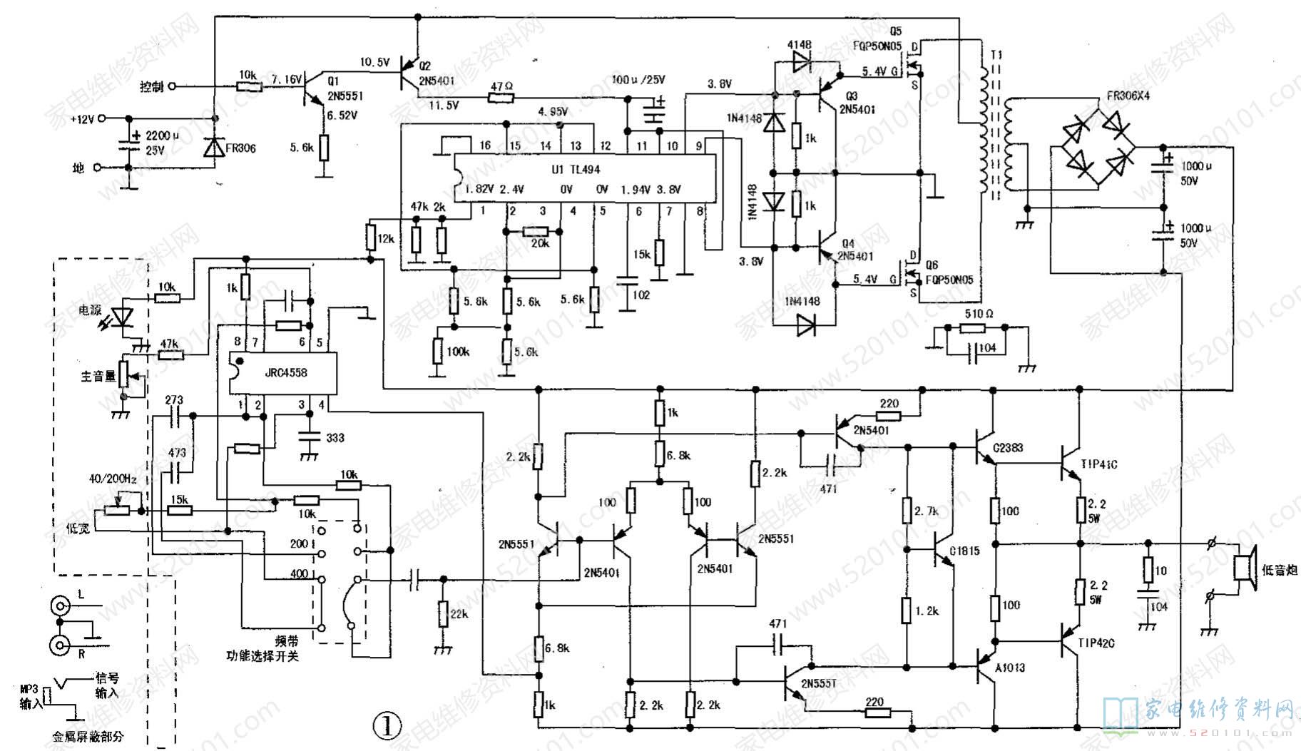 一台汽车低音炮功放,通电后放音无声。分析检修:汽车功放的功率放大电路与一般的家用功放机大同小异,但它的电源电路却相当复杂,往往使初次接触汽车功放的维修人员无所适从,而且此方面电路资料也比较缺乏。图1为根据电路元件实物绘制的电原理图,简述其工作原理如下:电源电路采用开关电源方式,将电瓶+12V供电经开关电源变换成±25V供给功放电路使用。它由电源振荡电路U1(TL494)和外围晶体管Q3、Q4,场效应功率管Q5、Q6构成。
