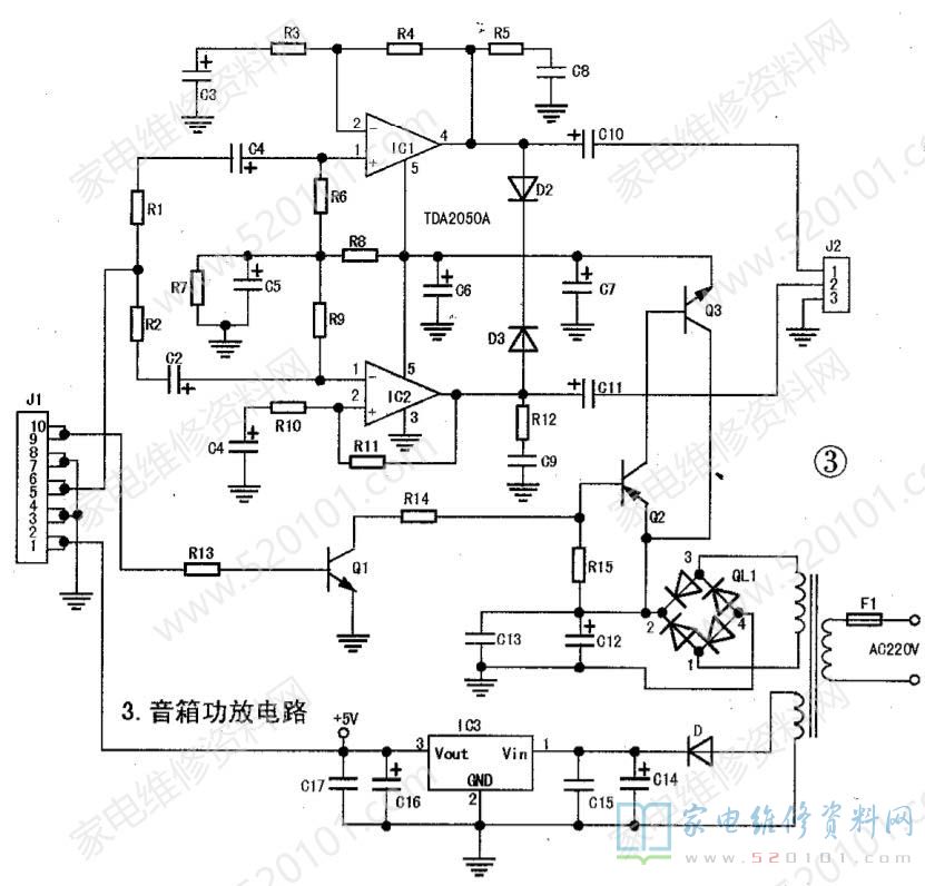 IC1、IC2为ST公司(意法半导体)生产的TDA2050,它是一种甲乙类音频功放电路,适用于未稳压的电源,电源电压可达44V。它内含自动限制功耗的短路保护电路和过热闭锁电路。