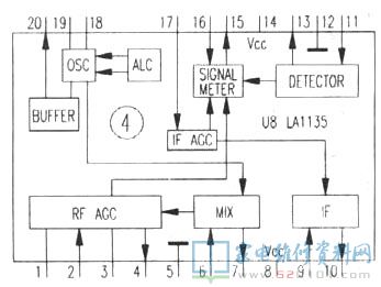 5、AM处理电路U8,这是唯一一片标有具体型号的芯片LA1135,其内部框图如图4。