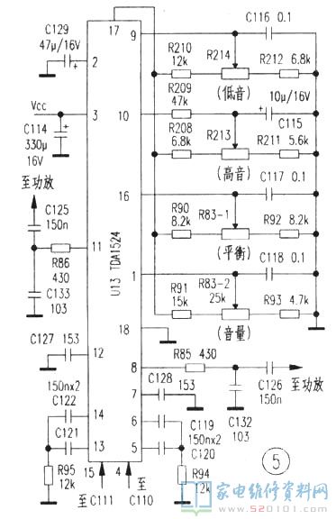 4、音量、音调、平衡控制电路U13,标号为DSS9220等,实测电路如图5。从功能、引脚判断,与常见的TDA1524应用一致,不同之处在于音量、音调控制电路与TDA1524的典型应用有别,可能与应用的环境有关。