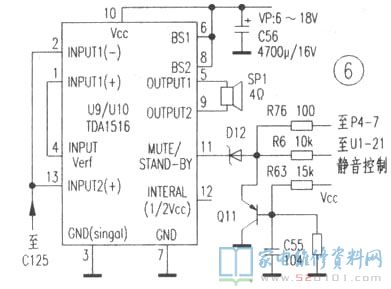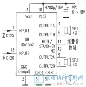 6、功放电路U9/U10,这是以前流行的两种机子的最大不同之处。两种机型均采用飞利浦车用功放,SIL13脚封装。经核查,双功放的电路与TDA1516应用完全相同。该芯片内含两个独立的功放。在供电电压14.4V、BTL接法、扬声器阻抗 4Ω、THD=10%时输出功率为24w,具体电路如图6;单功放电路与TDA1552应用完全相同,其内含四个功率放大电路,内部已接成两种BTL电路,在同样的条件下输出功率为2×22W,电就是说两种机型的输出功率是一样的,具体电路如图7。上述功放电路外围器件极少,与常见的TDA1521相比,除封装不同外,前者为汽车功放设计,外围器件少,采用单电源供电,可靠性高,满载时失真较大;而后者为Hi—Fi设计,可用单双电源供电,满载时失真较小。两种机型的静音电路相似,主要用于磁带放音倒带时关闭扬声器,此功能收音不用而空置。另外,道奇收音机是假的四声道,左右声道通过一个特殊的电位器将功率分配给前后四只扬声器。