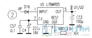 2、电源:收音电路、音频处理等采用三端稳压块U4,标号为8AI209等,其封装、管脚功能与常见的78系列一样,实测输出电压为10V;CPU、时钟电路则采用五端稳压块U5,输出电压为5V,与常见的L78MR05的使用、管脚相同。在道奇机中的应用电路如图2,其中第④脚用于监测主电源。