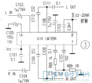 3、降噪电路(DNR)U14,标号为+CA9223M等,实际测绘的电路如图3。从引脚功能与元件参数判断,与常见的降噪芯片LM1894应用一致,降噪通过U2完成。
