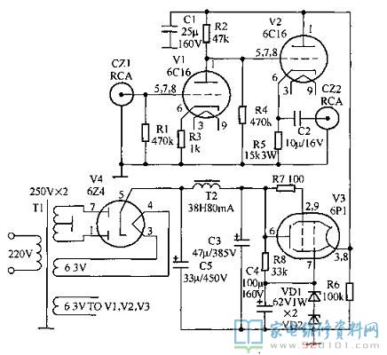 本电子管前置放大电路由两个独立的放大器组成,左右声道的放大电路完全相同。其放大器的输入级采用SRPP电路(分流调整式推挽放大器),其频率响应从10Hz~40kKHz增益变化仅为±1dB,信号噪声比可达80dB。本电路包括电源部分的电路图。 ...