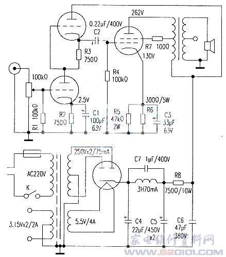 胆机采用6N1管组成SRPP推6P1单端甲类超线性功率放大器,由于采用了甲类电路,丰富的偶次谐波使声音优美悦耳,胆味浓郁。该电路简洁、用料少、易制作,电路原理如图2所示,输入级由双三极胆6N1组成的SRPP电压放大电路,该电路是常用的优秀电路...