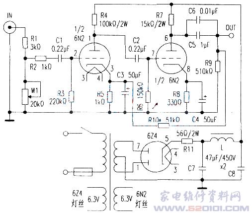 胆前级电路见附图,是常用的两级阻容耦合电压放大。电路中全部采用普通元器件,电源变压器是电子管收音机拆机品,型号DB-21-169型,性能可靠。全新的6N22只、6241只,6元左右,阻流圈用淘汰的8W日光灯镇流器代替,电阻用国产大红袍,电容用国产cz型,电解电容用国产天和牌。 由于元...