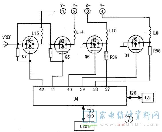 在未进行触摸时,U的41、42脚以毫秒级的速度连续不断地输出宽度相同,相位相反的扫描电压,配合U4的40、39脚的控制电压对触摸屏进行检测。当42脚输出低电平时,41脚输出高电平,40脚输出高电平,39脚输出低电平,因此Q7和Q6导通,Q5和Q4截止。VREF电压->Q7->L15->X+->X层面->XQ6->地,38脚线为X点坐标的检测脚;当41脚输出为低电平时,42脚输出高电平,40脚输出低电平,39脚输出高电平,此时Q7和Q6截止,Q5和Q4导通,VREF->Q5->L14->Y+->Y层面->Y->L8->Q4->地,37脚为Y点坐标的检测脚。以上两种工作方式轮流切换,直到检测到触摸操作为止。