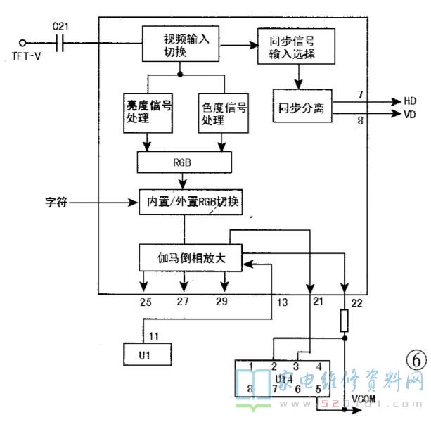 视频信号处理与时序控制电路简图如图6所示。U15是一块集成了视频信号转RGB信号处理电路RGB伽马校正、倒相、放大同步信号处理、行场分离、时序控制PWM调制等电路的大规模集成芯片。