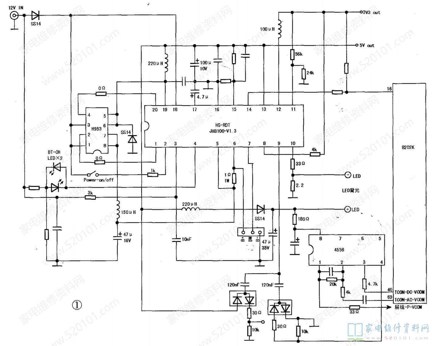 JH8100是一款电源管理芯片,采用贴片双列20脚封装方式,具有过压、过流保护及充电管理(在充电时,若电压超过15V就会自动断电)低电压提醒等功能,并内置有5V/3A和3.3V /1.2A的电压变换电路,以及3W的LED背光驱动电路。一款采用该芯片的移动DVD电源实测电路如图1所示,实测电压见表1。